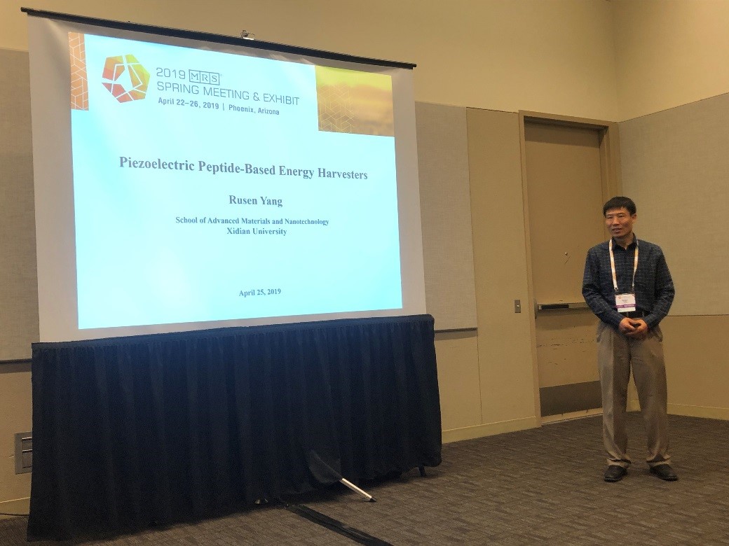 当地时间4月22日,材料科学领域顶级国际学术会议——美国材料研究学会(Materials Research Society)2019年度春季会议在美国菲尼克斯召开,杨如森应邀在大会上作了题为“Piezoelectric Peptide-Based Energy Harvesters”的特邀报告。报告会上,杨如森利用本次珍贵的展示机会,向与会人员介绍了学院师资队伍、学科建设、科学研究、实验平台等发展现状,宣传多层次的引才政策,向参会代表伸出了橄榄枝。在会议期间,还通过设立学院相关介绍的展台等多种方式展示a片动画