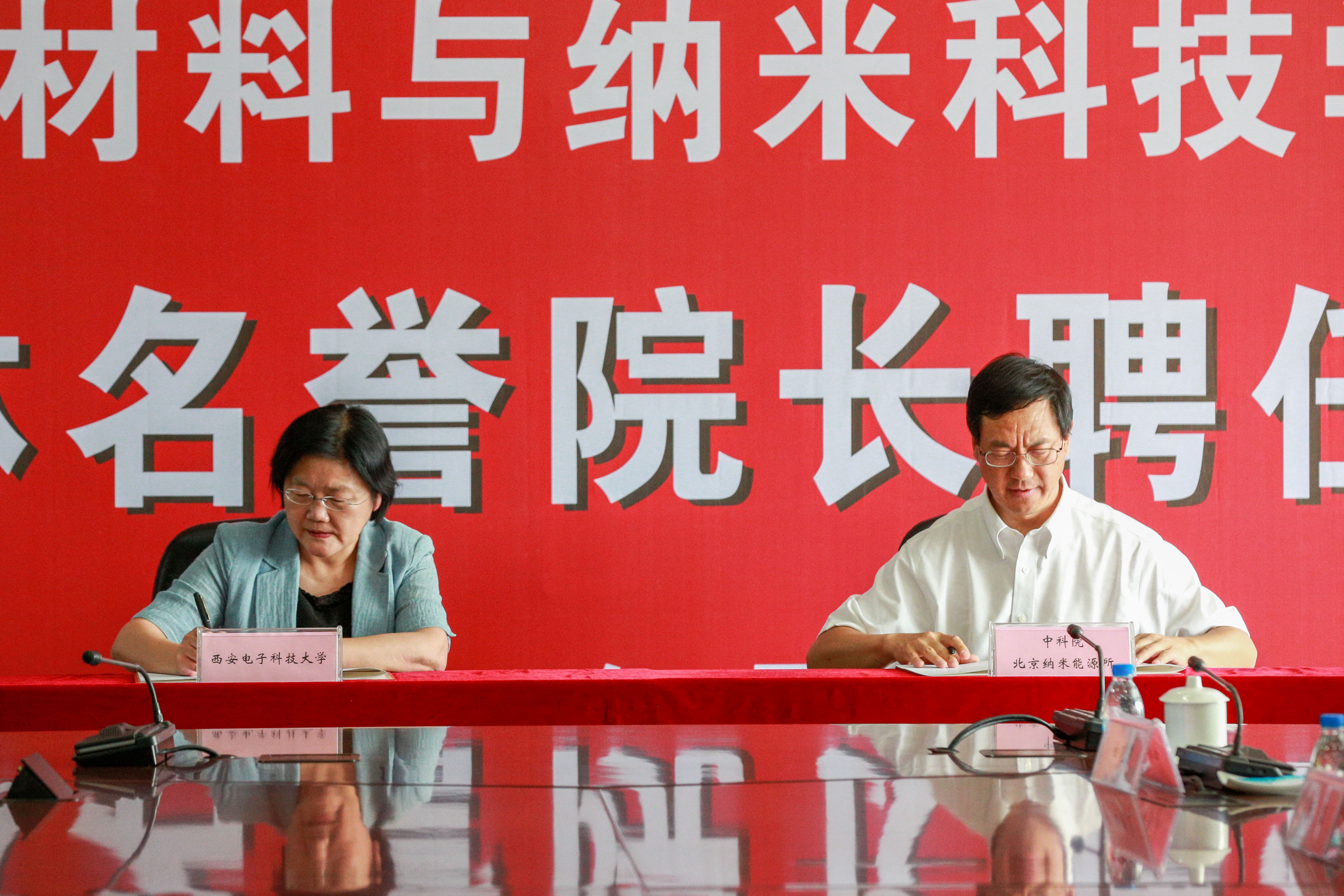 名誉院长、首席科学家、学术委员会主任的聘任文件。郑晓静为王中林佩戴校徽并颁发聘书。