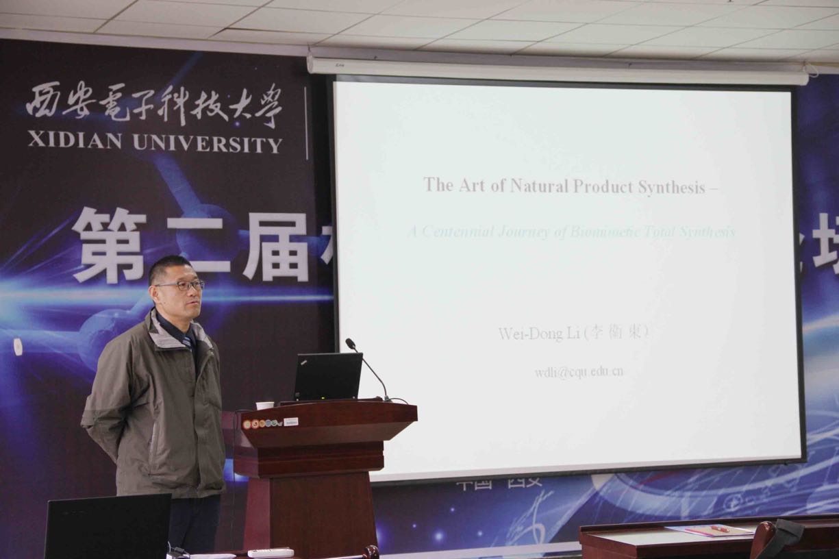 报告会于上午10:30分正式开始。首先,李卫东教授从有机合成的发展历史和仿生有机合成的研究背景,列举了经典的有机合成成果,如Robinson Synthesis of Tropinone (1917年),Barton Synthesis of Strychnine (1954年),Corey Synthesis of Antheliolide A (2006年)等。随后,李教授介绍了自己科研团队的研究内容及成果,分析了有机仿生合成未来发展的方向和面临的挑战。报告结束后,李卫东教授同在场师生进行了深入的互动交流。李卫东教授的研究方向为传统的有机全合成,在报告中,为了更贴近a片动画