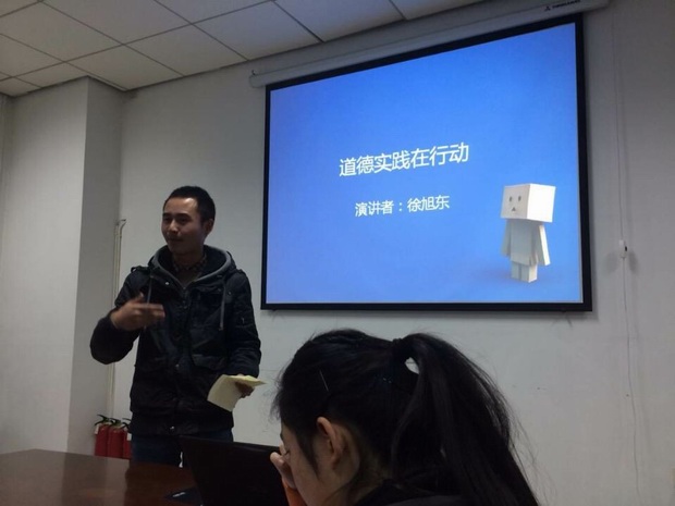 团委辩论队在G119举行了“朝闻道”系列英语演讲比赛,辅导员李伟嘉,前辩论队队长、模拟联合国主席李天以及现任辩论队队长张珊担任评委。