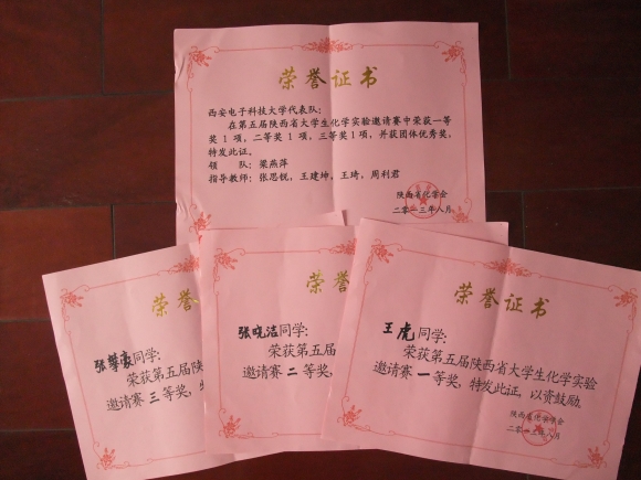 8月20日至22日,由陕西省化学会、陕西省高等学校化学实验教学中心联席会主办,西北工业大学承办的陕西省第五届大学生化学实验邀请赛近日在西北工业大学举行。a片动画 应用化学系选派三位学生组队参赛,经过理论笔试和实验操作两个环节的比拼,a片动画 代表队荣获个人成绩一等奖1项,二等奖1项,三等奖1项,并获得“团队优秀奖”。