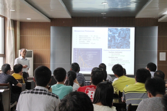 曹国忠教授介绍了其课题组在纳米材料应用于能源转换和存储领域的研究工作,重点从纳米结构光阳极在染料敏化与量子点敏化太阳能电池中的应用、纳米结构 电极在锂离子电池中的应用,以及多孔碳及其表面修饰在超级电容器中的应用等三个方面进行了介绍。a片动画