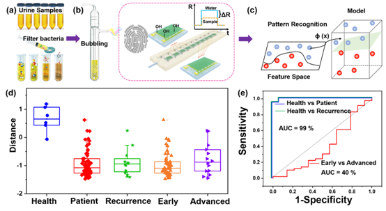 (a) 收集膀胱癌患者的尿液样本及过滤细菌(b) 将尿液样品鼓泡到电子鼻系统(c) SVM 模型的机制(d) SVM模型分析结果(e)ROC曲线