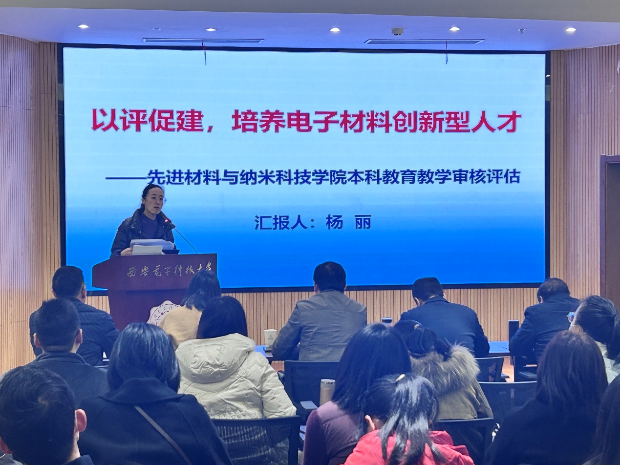 的发展沿革、师资队伍、人才培养、研究方向和特色核心课程教材体系等,并重点以“以评促建,培养电子材料创新型人才”为题进行汇报。她强调学院立足国家重大需求,把握西电电子信息特色,建设以物理、化学为基础,材料与电子交叉为特色的材料学科,服务于学校电子信息优势学科的发展,介绍了学院经过十年发展已建有本、硕、博、博后完整的人才培养体系,并从“人才培养规模、师资队伍、科学研究、平台条件、经费投入”等方面介绍学院本科生的人才培养成效。她表示各位教师从学院人才培养成效中要认识到学院本科人才培养存在的不足,针对学院精品课程、教材与获奖匮乏问题,学院邀请超过20所高校的国家级领军人才共同编著电子材料系列教材及专著,希望教师主动担当作为,注重课堂教学,努力提高学院本科人才培养质量;针对学院人才培养发展潜力和速度需提升问题,学院实施一对一进团队全方位培养学生创新能力,落实人才培养中的科研与平台纽带,持续性、渐进性培养学生创新能力和专业自信;针对学院创新能力培养课程体系、人才培养方案与模式不成熟,学院创办师昌绪电子材料菁英班带动教育教学研究,历时两年探索电子材料特色课程体系,所有课程实行团队负责制,保障课程质量与师资接力,培养兼具科学与工程能力的电子材料特色创新型人才。