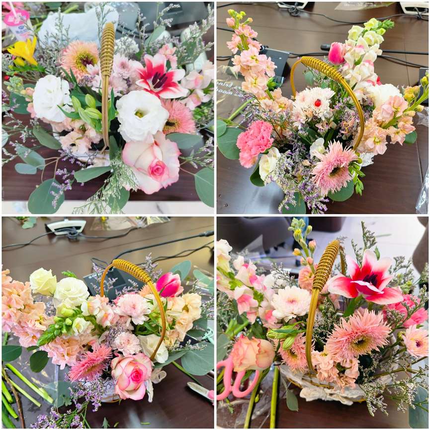 活动在花的芬芳中拉开帷幕,思思老师为大家讲授了花艺知识和鲜花日常保养细节,并从鲜花品种、色彩搭配、修剪造型、实操技巧等方面进行了详细讲解,在现场进行了生动的插花演示。在思思老师的指导下,活动现场气氛活跃,大家边看边学,边交流边探讨,充分发挥自己的想象力,用自己灵巧的双手,将郁金香、玫瑰、康乃馨等多种花材,有层次地搭配在一起,一篮篮花团锦簇、生机盎然的插花作品呈现眼前,大家对自己的作品爱不释手,纷纷拿出手机记录美好时刻,活动现场到处洋溢着花香和欢笑。