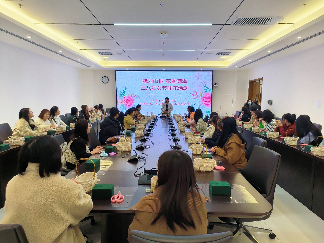 和校工会联合面向全校女教职工在南校区112会议室举办“魅力巾帼 花香满溢”为主题的三八妇女节插花讲座活动。全校女教职工50余人参加本次活动,活动由学院组织员王庆毅主持。