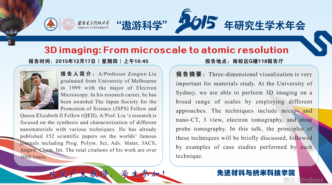 报告人简介:A/Professor Zongwen Liu graduated from University of Melbourne in 1999 with the major of Electron Microscopy. In his research career, he has been awarded The Japan Society for the Promotion of Science (JSPS) Fellow and Queen Elizabeth II Fellow (QEII). A/Prof. Liu ‘s research is focused on the synthesis and characterization of different nanomaterials with various techniques. He has already published 152 scientific papers on the worlds’ famous journals including Prog. Polym. Sci, Adv. Mater, JACS, Angew. Chem. Int. The total citations of his work are over 3000 times.