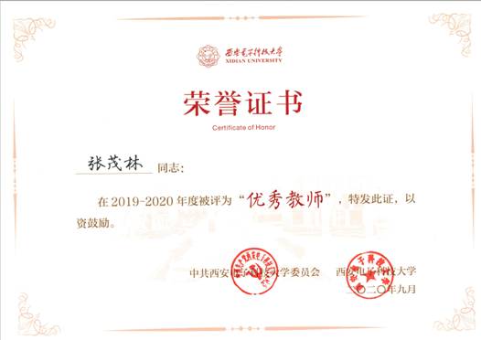 在教育教学过程中,张茂林老师始终坚持以身作则、关爱学生,努力培养学生正确的人生观、价值观和世界观,用强烈的责任感、使命感、人格魅力和道德风范来影响教育学生,师生关系融洽。2018年获得“大学生创新创业训练优秀指导教师”,2019届指导的3名硕士毕业生中,2名同学获评“优秀毕业研究生”,2名同学论文被评为“校级优秀硕士学位论文”,1位同学论文荣获“中国电子学会优秀硕士学位论文”(全国共23位)。所培养的研究生具有扎实的学科基础、较强的实践和创新能力,均就业于实力强劲的企事业单位和知名公司,受到用人单位的充分肯定。