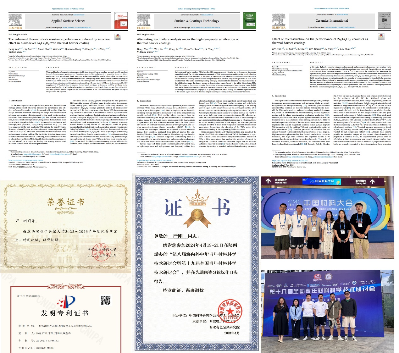 暮春初夏时分,夭夭桃花已不再灼灼其华,但少年寻梦的山海旷野依旧青绿。自从进入研究生阶段以来,严刚展现出了非凡的科研潜力,用热血和激情点燃了自己的科研之路,用坚韧和智慧攀登着科学的高峰。他的研究方向是热障涂层热力化极端环境模拟与损伤检测,虽然这一前沿领域充满着无尽挑战,但他始终以饱满的热情和顽强的毅力投入其中。科研旅途,荆棘丛生,科研过程中的他也遇到了无数的困难和挫折,实验数据的波动、实验设备的故障、理论模型的推翻,这些都曾让他感到困惑与压力。面对困难,他从未放弃,总是以积极的态度面对每一个问题,努力寻找解决的办法。他常常在实验室里通宵达旦,不断地开展实验、分析数据、调整方案。在导师的指导下,他在短短的几年内取得了显著的科研成果。他先后以第一作者或共同作者在Applied Surface ScienceSurface and Coatings Technology Ceramics International国际知名期刊上发表多篇高质量论文,获得授权国家发明专利2多次参加中国稀土大会、全国青年材料科学技术研讨会、全国力学博士生学术论坛等国内会议并做口头报告,在中国材料大会等会议进行墙报交流,了解科研前沿动态,开拓科研新思路。