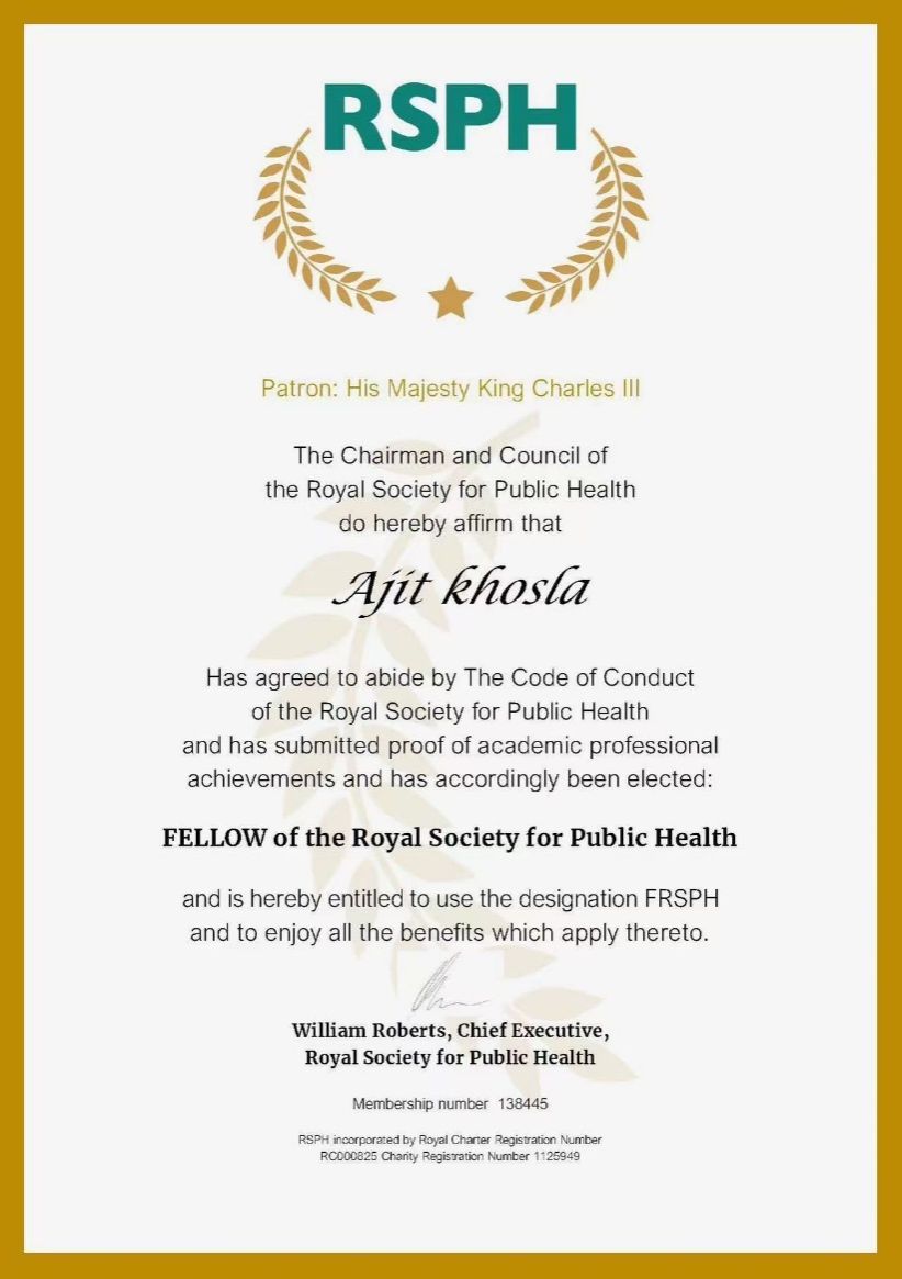 Ajit Khosla教授荣膺英国皇家公共卫生学会会士称号