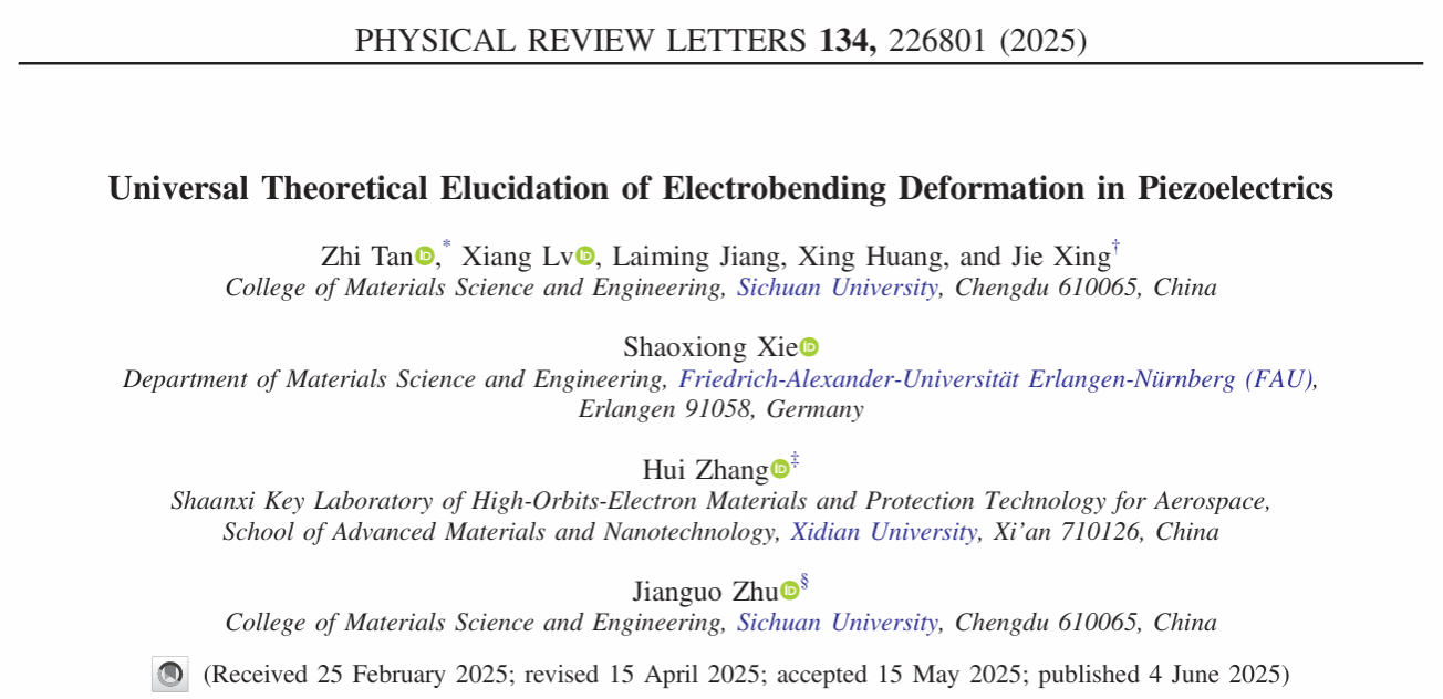 此前不久,张辉老师和四川大学谭智副研究员,邢洁副研究员,朱建国教授合作在美国物理学会旗舰期刊《Physical Review Letters》影响因子为9.0以“Universal theoretical elucidation of electrobending deformation in piezoelectrics”为题发表了最新研究论文。