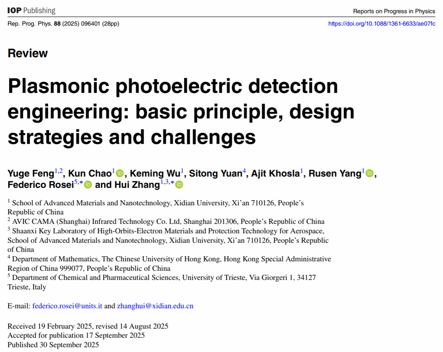 (通讯员  陈涛)2025年9月,a片动画 张辉老师和意大利的里雅斯特大学Federico Rosei教授欧洲科学院院士加拿大皇家科学院院士加拿大工程院院士,发展中国家科学院院士合作受邀以“Plasmonic photoelectric detection engineering: basic principle, design strategies and challenges”为题影响因子为20.7物理类国际顶级期刊Reports on Progress in Physics上发表了综述论文