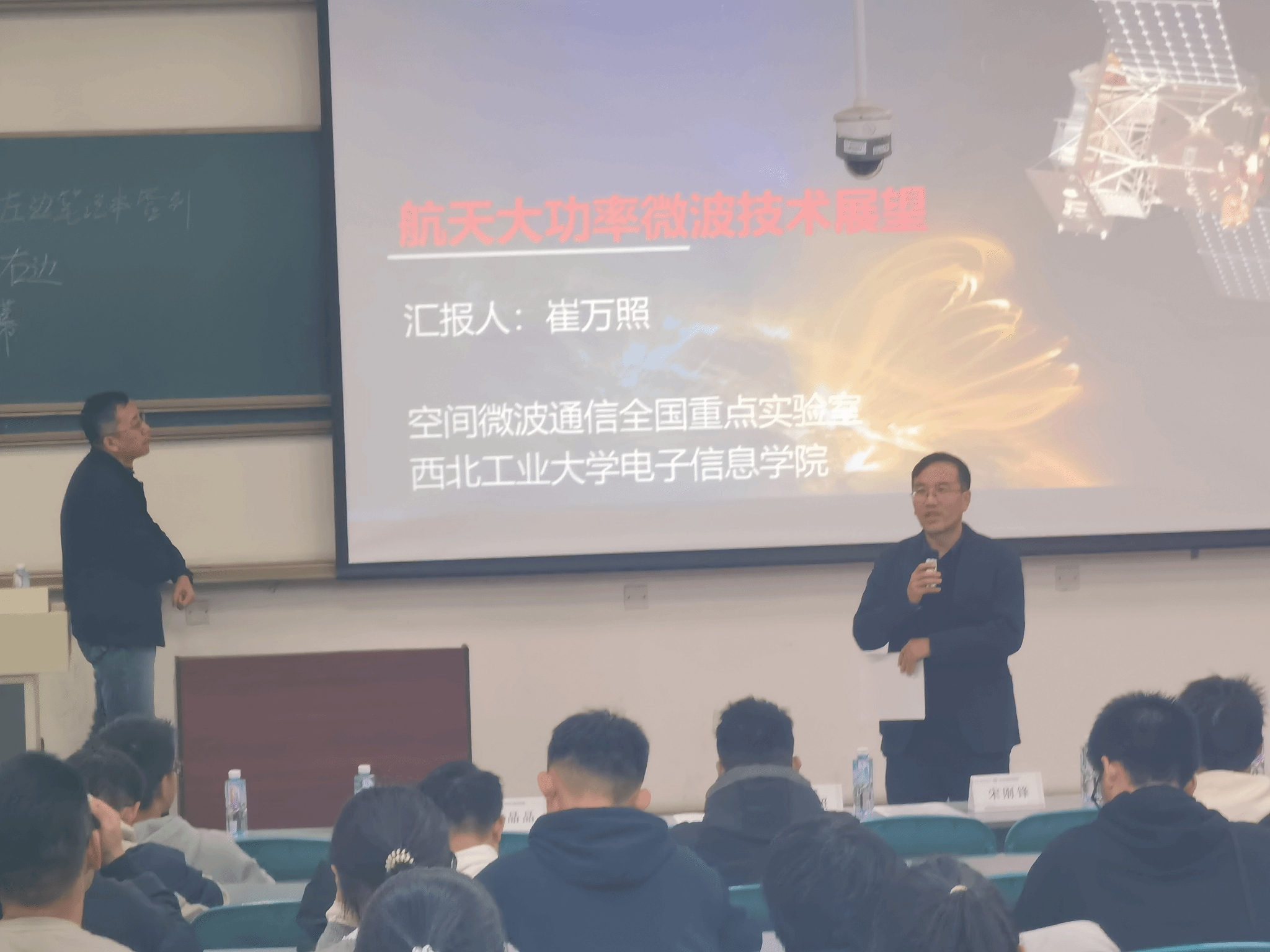 在南校区D-205教室举办“电子材料菁英人才系列论坛”,聚焦航天领域核心技术,特邀中国空间技术研究院西安分院研究员、博士生导师崔万照,作“航天大功率微波技术展望”的专题报告,200余名师生参与,学院党委书记宋刚锋主持。