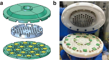 图1(a)腔室分体结构设计图,(b)腔室内部结构实物及传感器位置图。