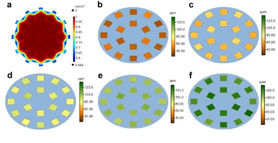 图3(a)传感器阵列上方模拟浓度分布(2s),(b)-(f)传感器阵列上方实际水蒸气浓度分布。