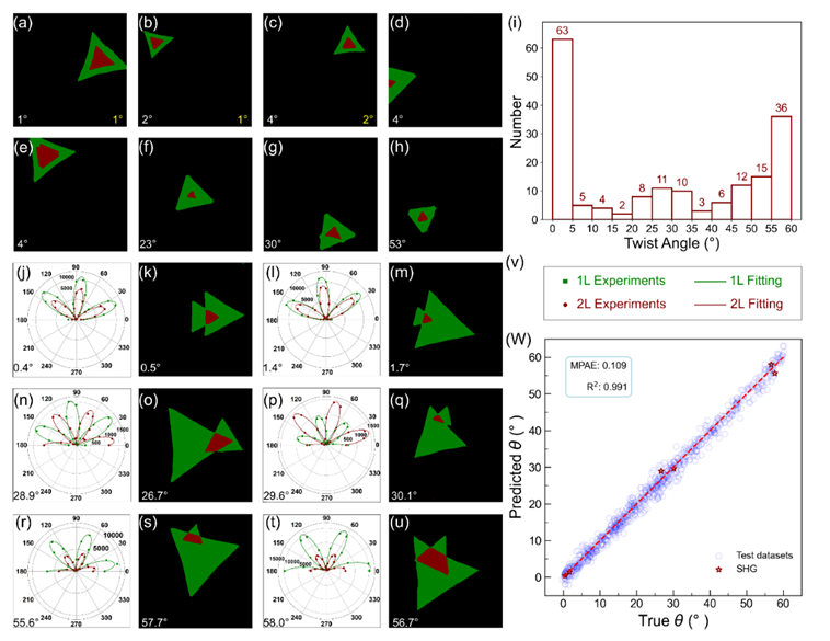 与中科院半导体所通力合作,首次实现了采用深度学习方法识别CVD生长双层二维材料的转角。首先,本工作使用光学显微镜收集了CVD制备的二硫化钼(MoS2)的颜色空间,并应用语义分割卷积神经网络(CNN)来准确快速地识别MoS2的厚度。其次,本工作训练了第二个CNN模型,以实现关于CVD生长的双层TMD材料旋转角度的精确预测,该模型创新性的使用了超过10,000个历经巧妙设计的人工合成图像的转角数据集用以训练网络,包括从六边形到三角形的几何形状。通过二次谐波和拉曼光谱的后续验证,证明设计的神经网络能够对双层TMD材料转角进行快速、精确预测。论文一经发表即得到耶鲁大学Diana Qiu教授的引用(arXiv:2404.14601),指出我们的工作使量子理论扩展到理解更大和更复杂系统的物理成为可能。