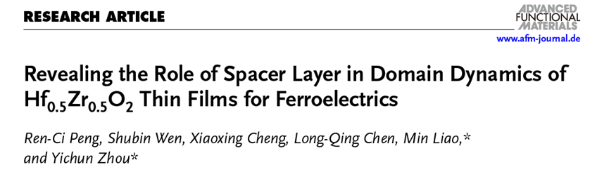 研究成果以揭示Hf0.5Zr0.5O2薄膜中隔离在铁电畴翻转动力学中的作用(Revealing the Role of Spacer Layer in Domain Dynamics of Hf0.5Zr0.5O2 Thin Films for Ferroelectrics)为题最近在线发表在材料领域著名学术期刊Advanced Functional Materials。a片动画 副教授彭仁赐、与博士生文树斌为论文共同第一作者,廖敏授与周益春教授为共同通讯作者,其他重要贡献者包括深圳大数据研究院研究科学家程晓行博士、美国宾夕法尼亚州立大学陈龙庆教授。研究工作受到国家自然科学基金委和陕西省自然基金支持。