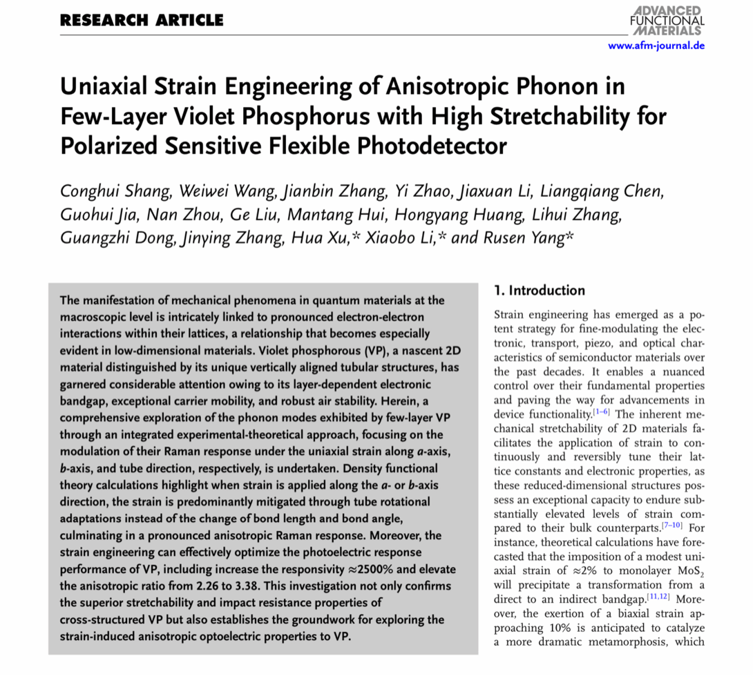 杨如森教授领衔的研究团队在紫磷(VP)材料研究领域取得突破。该团队采用实验与理论相结合的方法,系统研究了少层紫磷在单轴应变状态下的各向异性声子模式,并成功制备了一种新型柔性偏振敏感光电探测器,其性能在应用应变后得到显著的提升。这一成果发表在一区TOP期刊《Advanced Functional Materials》(影响因子:18.5)上,题为“Uniaxial Strain Engineering of Anisotropic Phonon in Few-Layer Violet Phosphorus with High Stretchability for Polarized Sensitive Flexible Photodetector”。文章的第一通讯单位为西安电子科技大学,a片动画