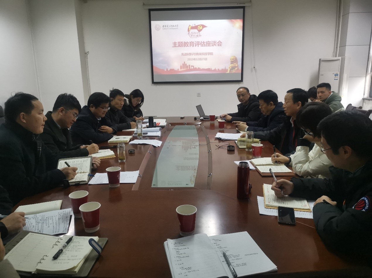 党委在G-119会议室召开“不忘初心、牢记使命”主题教育评估座谈会,测评学院主题教育开展情况。校第一指导组成员王跃利、王海波、张维宁到会指导测评,学院领导班子成员、支部书记代表、教职工代表、学生党员代表以及群众代表共同参加了本次会议,会议由学院党委书记卢硕主持。
