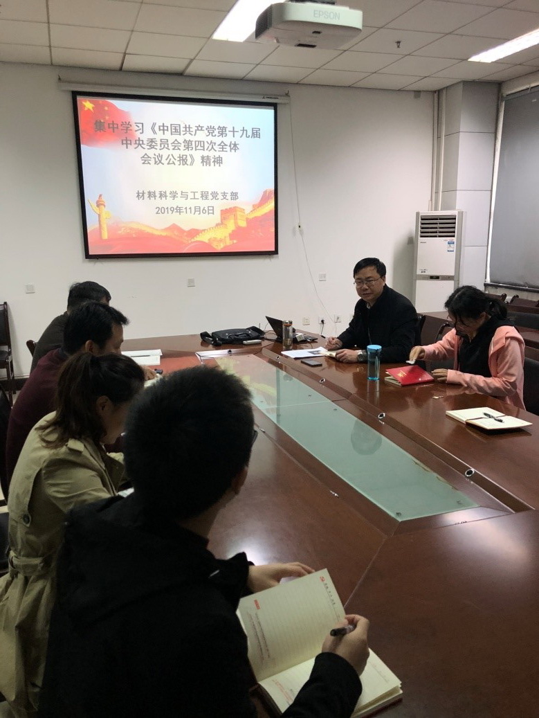 (通讯员:王珍妮)2019年11月6日上午,由材料科学与工程系支部组织,全系教师在G楼119会议室学习《中国共产党第十九届中央委员会第四次全体会议公报》,学习党的十九届四中全会精神,会议由支部书记李智敏主持。