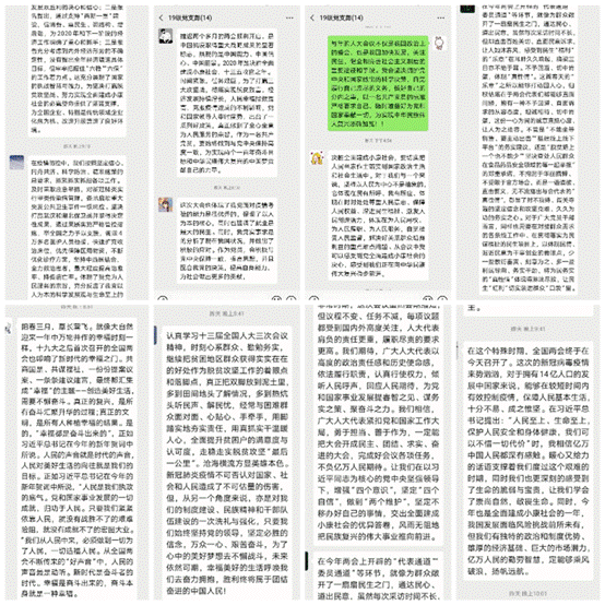 18级硕士党支部党员冯凯丽谈到,这次会议虽时间缩短,但却感触颇深,一方面感触最深的就是全体默哀,体现了对于逝去同胞的缅怀悼念,也真正体现了我们国家以人民为中心的发展思想,习近平总书记来陕视察时也强调更加注重保障基本民生,天下顺治在民富,天下和静在民乐;另一方面就是面对这次新冠肺炎疫情,国家强大的执行力和号召力使得我们中华民族更加团结,在今后的生活中需更加认真学习,并深刻领会“两会”精神。