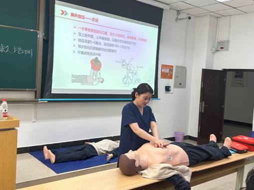 随后,肖薇通过对模拟人实施心脏复苏抢救以及AED的模拟使用,向师生们演示了如何判断检查患者有无意识与自主呼吸,口腔异物的检查与清理,人工呼吸与AED的相关操作流程。在演示过程中,肖薇反复示范正确急救操作的步骤及手法,力争每位参训人员都能掌握心肺复苏的技巧。在实践操作时,师生们分组依次进行心肺复苏实际操作演练,按照相关流程规范使用AED设备。通过现场的实际操作教学,进一步提高了参训人员对急救操作的了解程度和心肺复苏操作的规范程度。