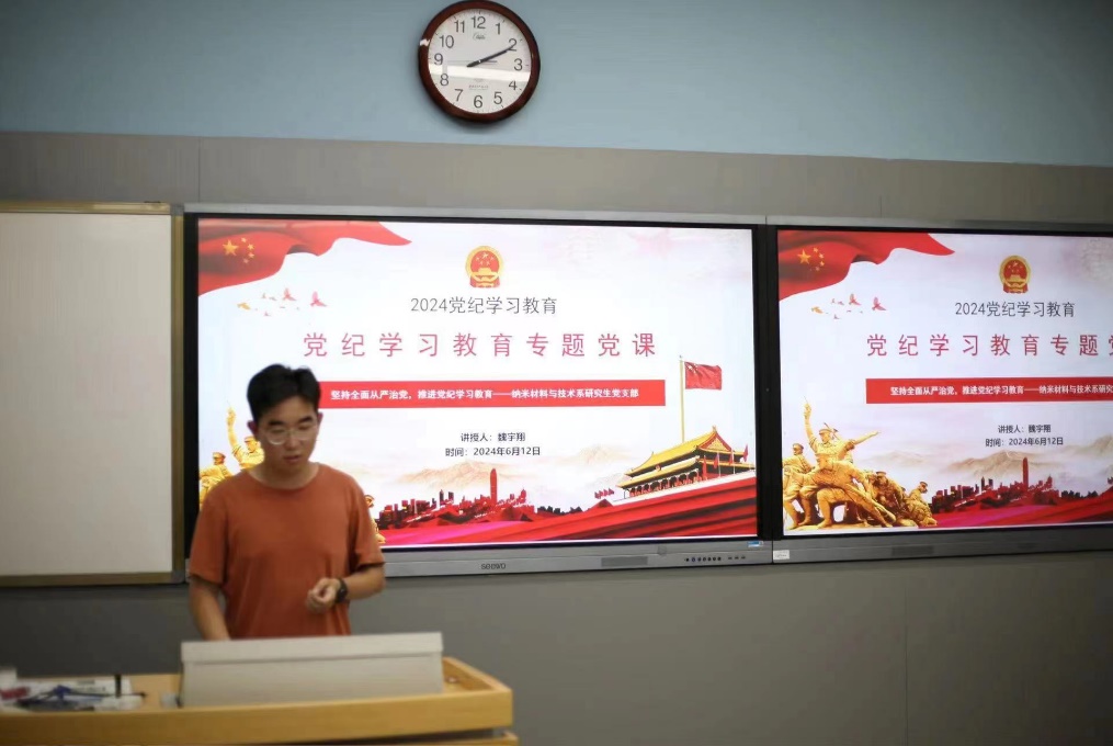 纳米材料与技术系研究生党支部在C楼126召开会议,支部书记魏宇翔以“坚持全面从严治党 推进党纪学习教育”为主题讲授专题党课。