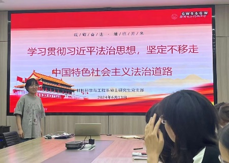 材料科学与工程系研究生党支部在南校区G楼142会议室开展党纪学习教育,党支部书记王赛婧以“学习贯彻习近平法治思想,坚定不移走中国特色社会主义法治道路”为主题讲授党课。