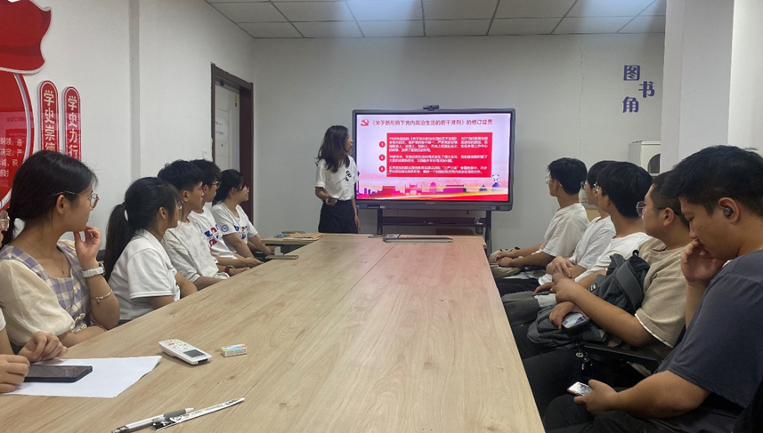 在重点解读环节,李逸君对党规党纪的三大板块和十二个部分进行深入分析。她特别强调了党内政治生活的重大作用和历史经验,明确了党内政治生活在党的建设中的核心地位。她也直面当前一些突出问题,如大学生考风考纪等,她强调,大学生作为国家栋梁,应以身作则,树立良好学术道德和诚信考试风尚。她呼吁每一位大学生党员,自觉遵守考试纪律,诚实守信,以实际行动维护学术纯洁性和考试公正性。她号召全体党员学习贯彻党规党纪,深刻理解精神实质,不断提高政治素养和纪律意识,为党的事业贡献力量。
