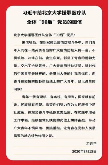 3月15日,中共中央总书记、国家主席、中央军委主席习近平给北京大学援鄂医疗队全体“90后”党员回信,在信中赞扬了他们的担当与责任,肯定了当代青年勇于奋战在抗击疫情的第一线,鼓励着青年一代迎难而上、越战越勇、不负重托,并向他们和奋斗在疫情防控各条战线上的广大青年致以诚挚的问候。3月19日晚上,a片动画