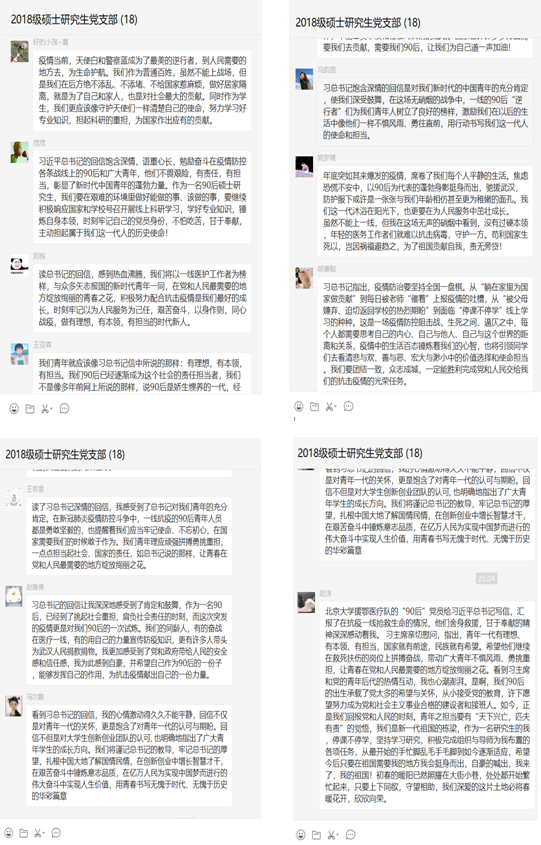 宣传委员张兴茂说:“习近平总书记的回信饱含深情,语重心长,勉励奋斗在疫情防控各条战线上的90后和广大青年,作为一名90后硕士研究生,我们要在艰难的环境里做好能做的事、该做的事,要继续积极响应国家和学校号召开展线上科研学习,学好专业知识,锤炼自身本领,时刻牢记自己的党员身份,不怕吃苦,甘于奉献,主动担起属于我们这一代人的历史使命”