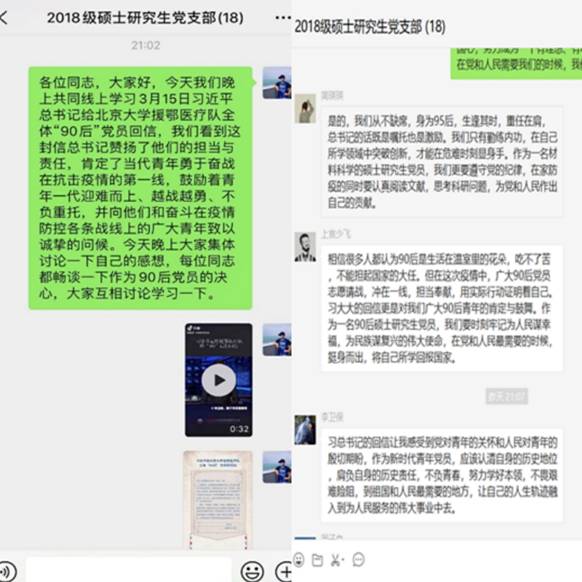 2018级硕士党支部开展线上集体学习此次回信精神,并展开积极讨论。
