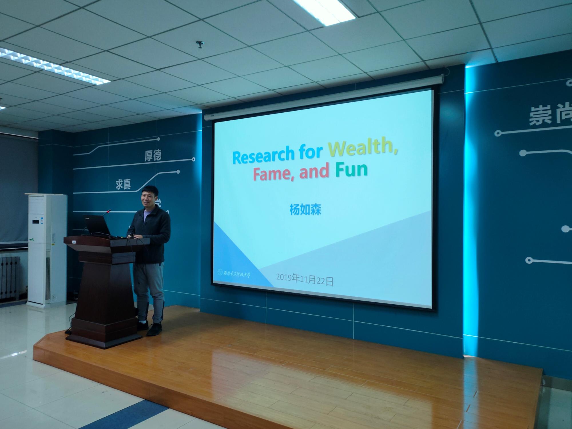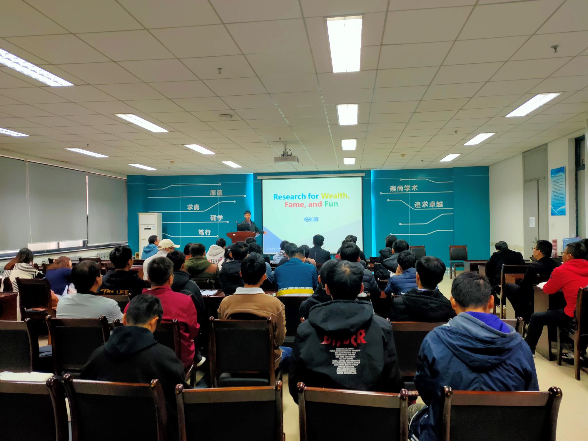 在南校区G118举办了学术年会之“对话教授”专题活动,学院杨如森教授应邀作题为“Research for Wealth, Fame, and Fun”的学术报告。2018级和2019级研究生70余人参加,学院副书记程远主持报告会。