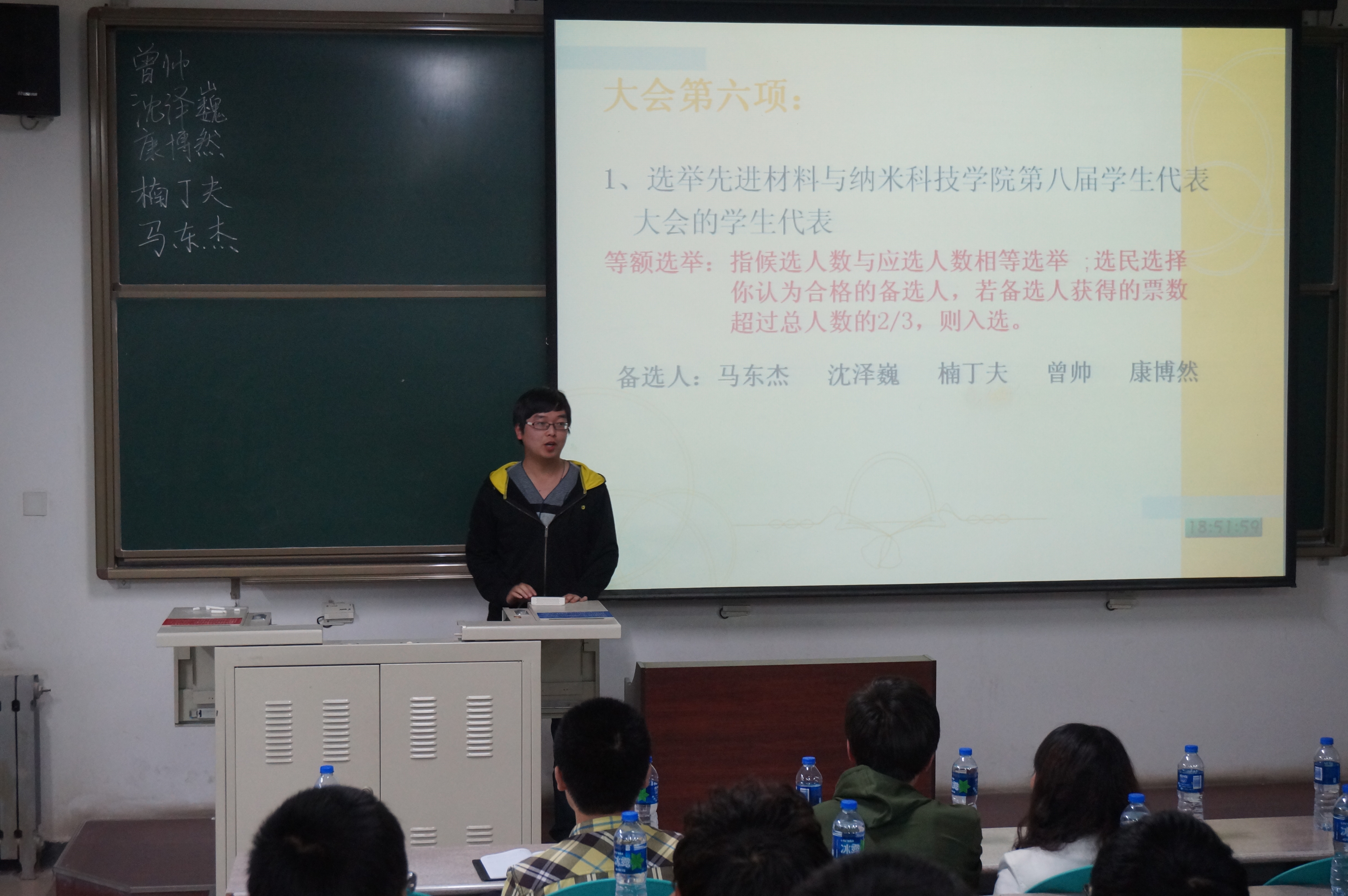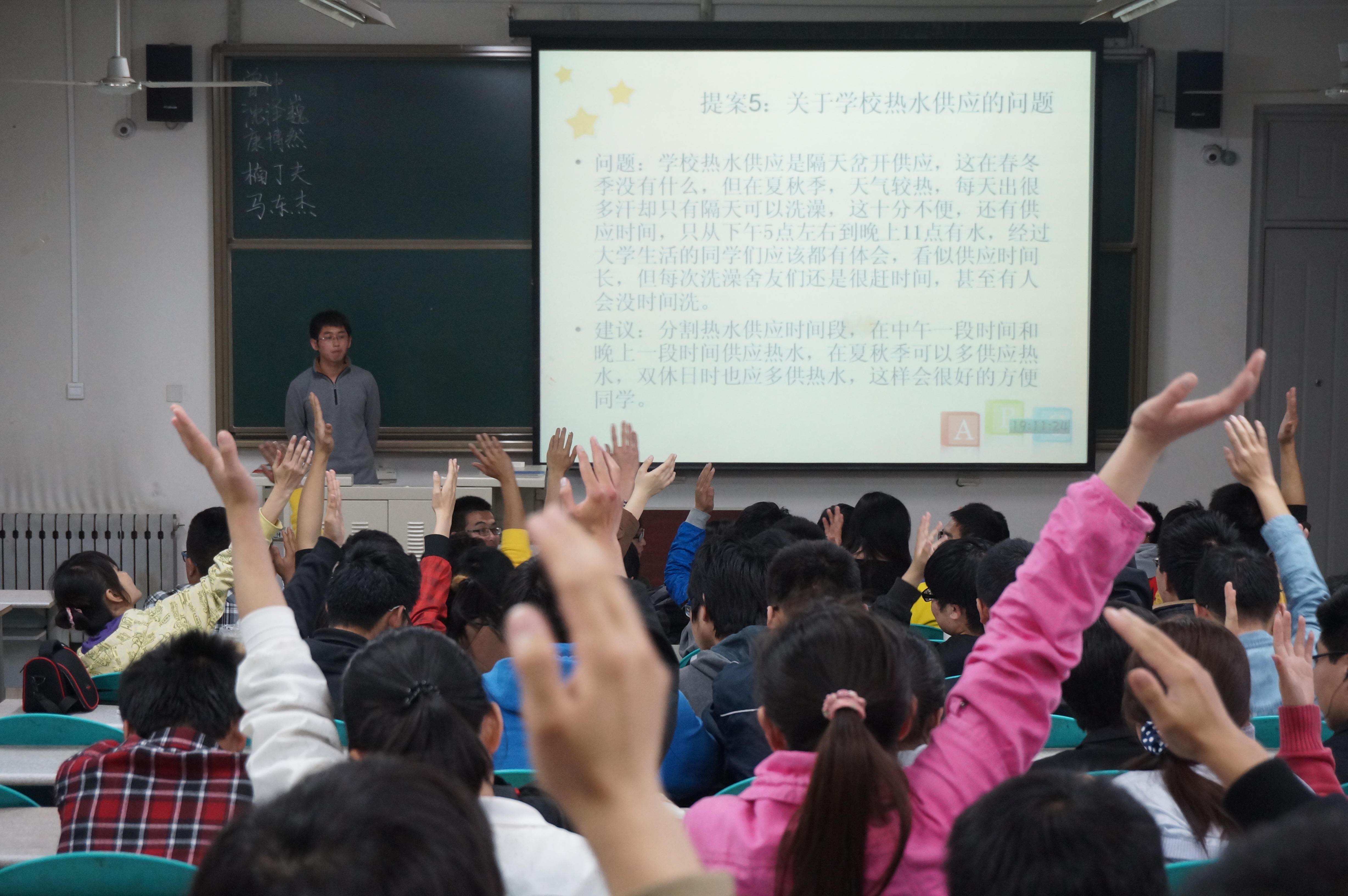 大一学生贺龙主持,本次大会的主要议程是:1.对院学生会工作进行总结与规划。2.听取并表决选举委员会的相关提案。3.选举产生第八届校学生代表。4.选举产生第八届委员会委员候选人。本次大会选举采用等额选举。学生代表候选人分别为曾帅,沈泽巍,康博然,楠丁夫,马东杰。委员候选人分别为曾帅,沈泽巍。本次选举,候选人皆以超过三分之二的票数顺利通过。本次大会的提案主要有12项:1.关于新综合楼恶臭散发问题。2.关于学生公寓中晒被子难问题。3.关于校园垃圾分类处理问题。4.关于宿舍楼前自行车停放不便问题。5.关于学校热水供应问题。6.关于提供前往校医院交通工具问题。7.关于学校安全问题。8.关于学生平时饮食问题。9.关于操场晚上供电时间问题。10.关于宿舍熄灯时间问题。11.关于在校买火车票机票问题。12.关于校园网经常断问题。选举会成员对于这些提案极为关心,在听取于表决中表现非常积极,每一项都受到众选举会成员的强烈认可。
