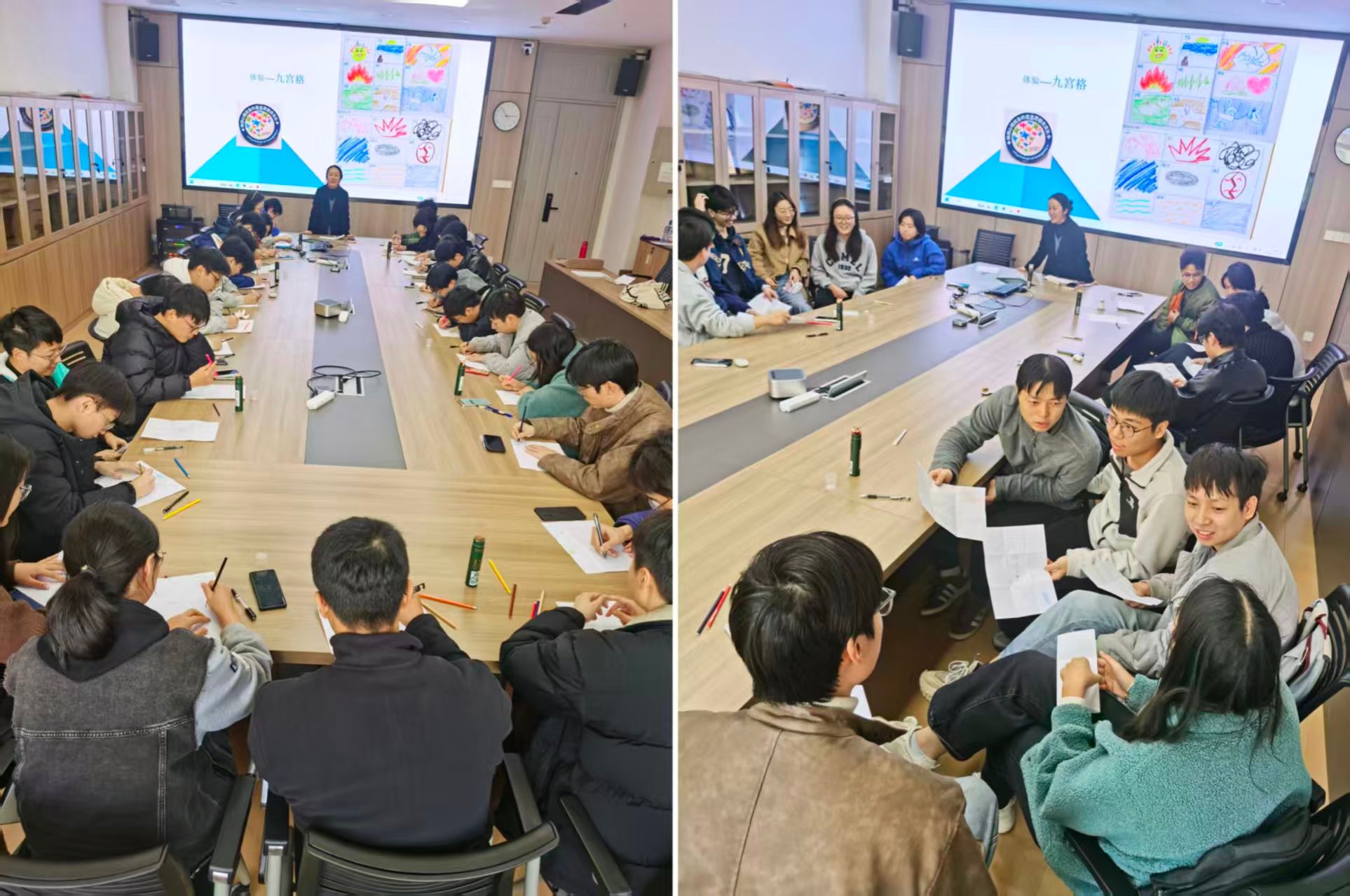 核心环节中,“情绪传声筒”游戏让同学们印象深刻。参与者依次传递特定情绪的语气与肢体信号,在此过程中因理解偏差产生的趣味效果,让大家直观感受到情绪表达与传递的复杂性。随后的“情绪九宫格”绘制环节,同学们用色彩与线条勾勒出科研、生活中遇到的各类情绪场景,标注出情绪触发点与当下的应对方式。在小组分享中,大家互相解读画作背后的心境,在交流中发现“实验瓶颈的焦虑”“人际沟通的困惑”等都是研究生群体的共同困扰,归属感与共鸣感油然而生。